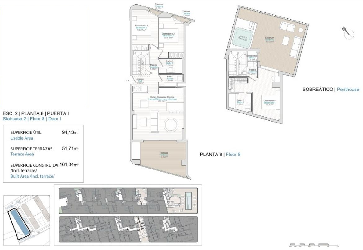 8-I. Takvåning, plan 8. Sovrum 3. Badrum 2. Terrass 52 m2. Boyta 94 m2. Pris 686 000 €