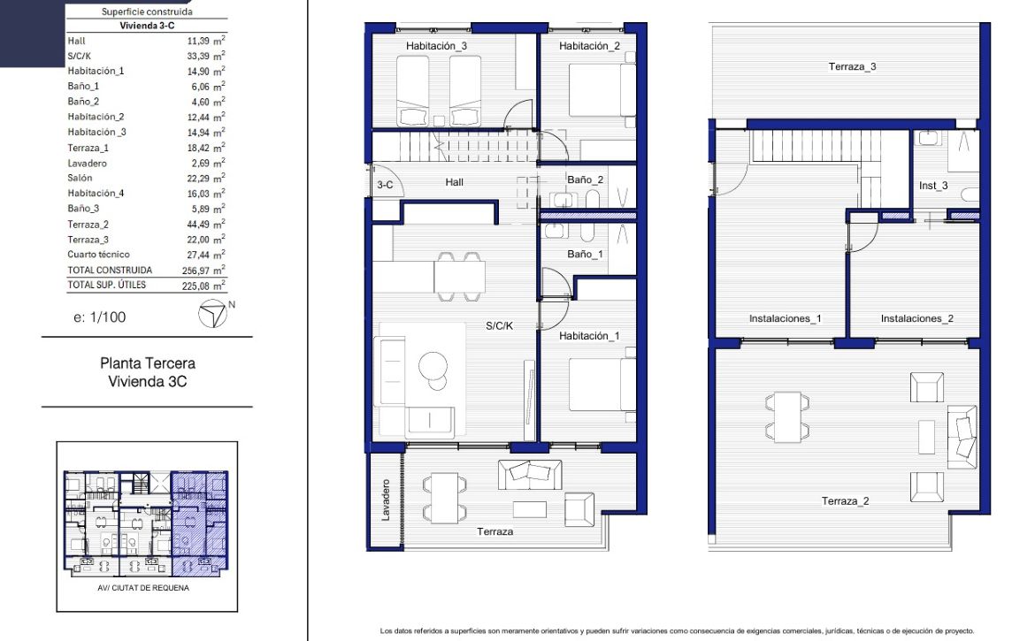 Våningsplan 1: sovrum 3, yta 119 kvm. Terrass. Pris 362.250 €